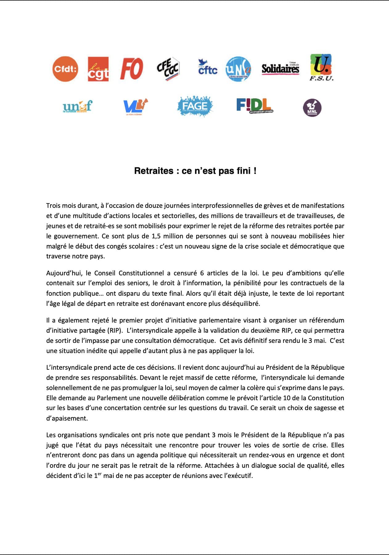 Avec la Fédération de la Gauche Républicaine et le Mouvement Républicain et Citoyen, je continuerai à soutenir les actions décidées par l’intersyndicale unie.